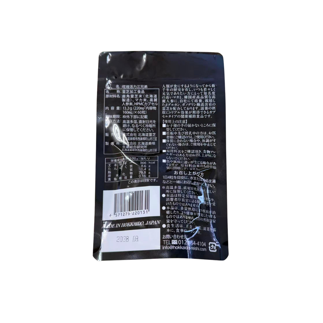 This is the first supplement for men in Japan that combines maca, reishi mushroom, and ginseng.