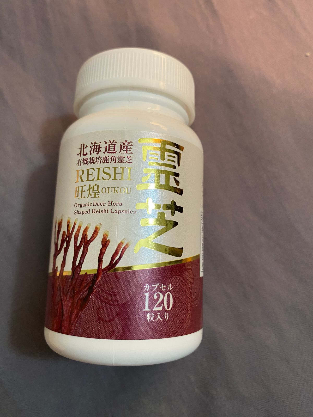 A bottle of 120 capsules containing 100% finely powdered Deer Horn reishi mushrooms (deer antler-shaped Ganoderma lingzhi).